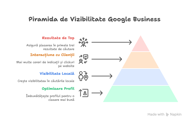 Când cineva caută “pizza lângă mine” sau “instalator în [oraș]”, Google-ul se uită la Profilul tău Google Business ca să decidă dacă trebuie să apari. Cu cât profilul tău este mai bun, cu atât mai sus te clasezi.