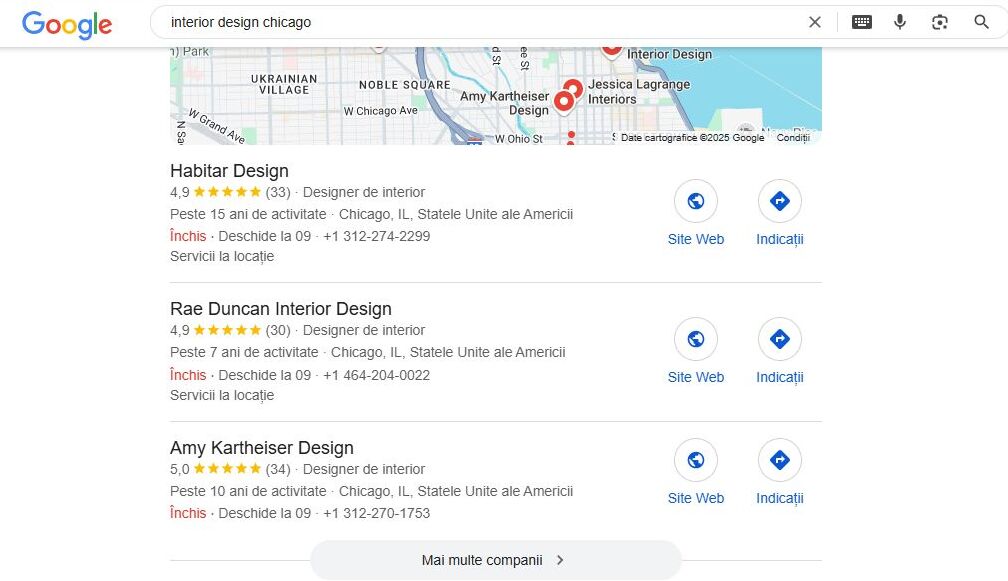 Pentru o firmă de amenajări, unde vizualul și încrederea locală sunt esențiale, un profil Google Business optimizat este o mină de aur. Apariția în acele prime 3 poziții pe Google Maps (Local Pack) pentru căutări precum “firmă amenajări interioare Sector 1” sau “proiectare grădini tematice Băneasa” poate aduce un flux constant și valoros de clienți.
